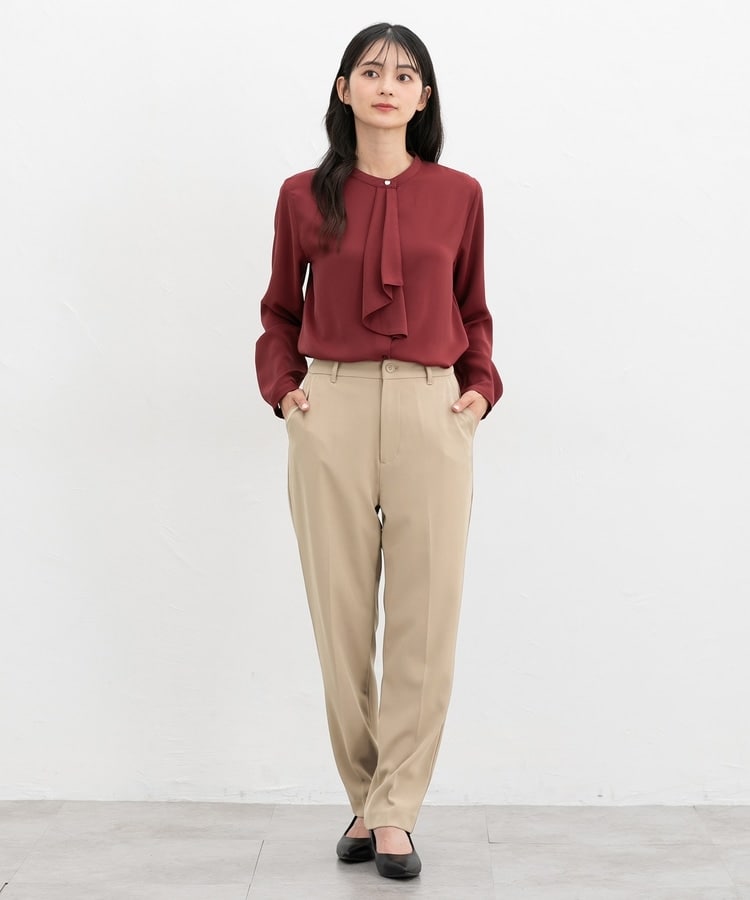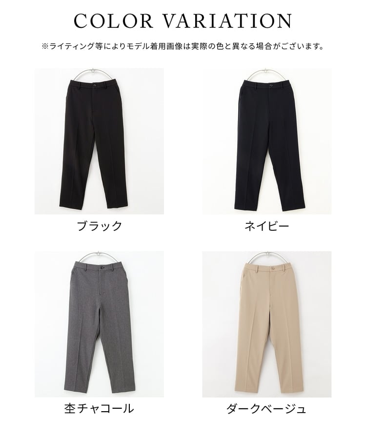 きちんと感のあるセンタープレス入りで、美脚効果も抜群のテーパードパンツ、股下66cmタイプ。