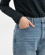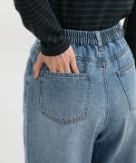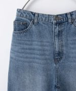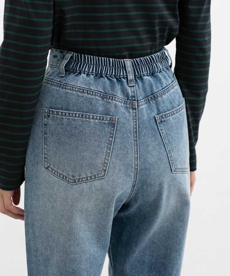 水の使用量を削減し、レーザーによるダメージ加工で薬品を使用せず、環境に配慮して作られた、柔らかめで洗濯後も乾きやすい綿混デニム素材。