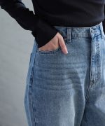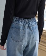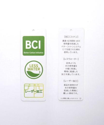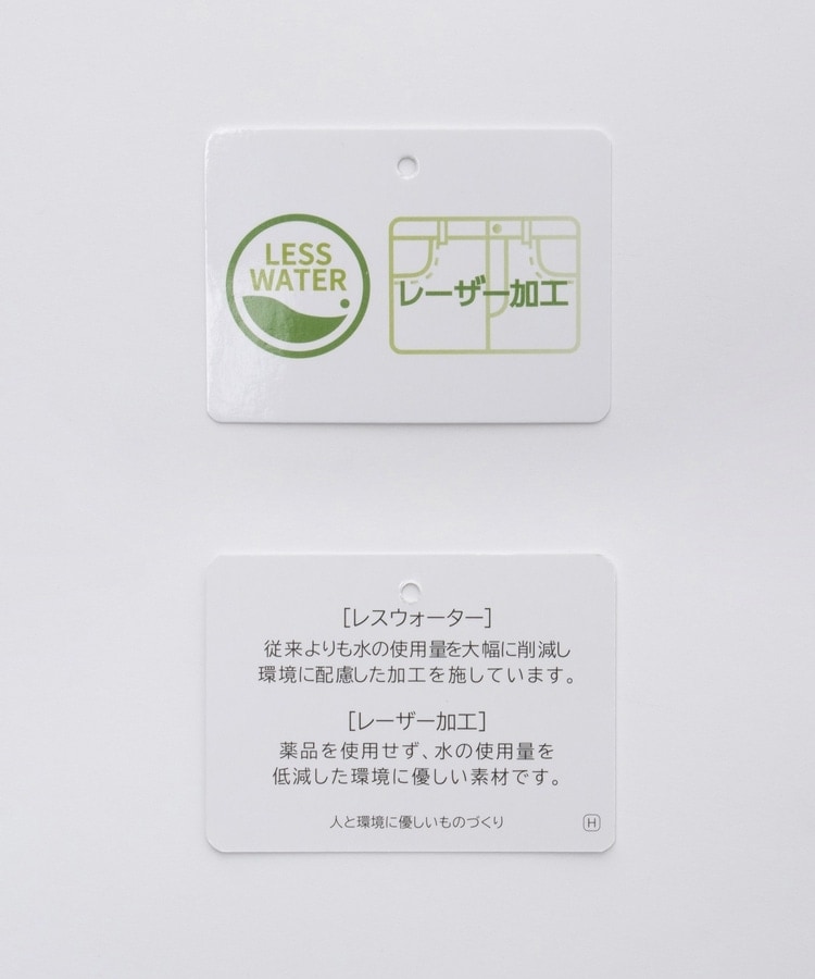 水の使用量を削減し、レーザーによるダメージ加工で薬品を使用せず、環境に配慮して作られた、柔らかめで洗濯後も乾きやすい綿混デニム素材。