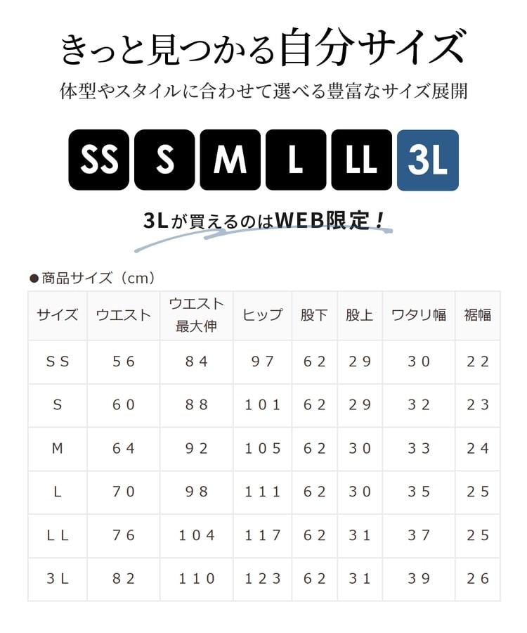自分にぴったりが見つかる、SS~3Lまで揃った豊富なサイズ展開。
